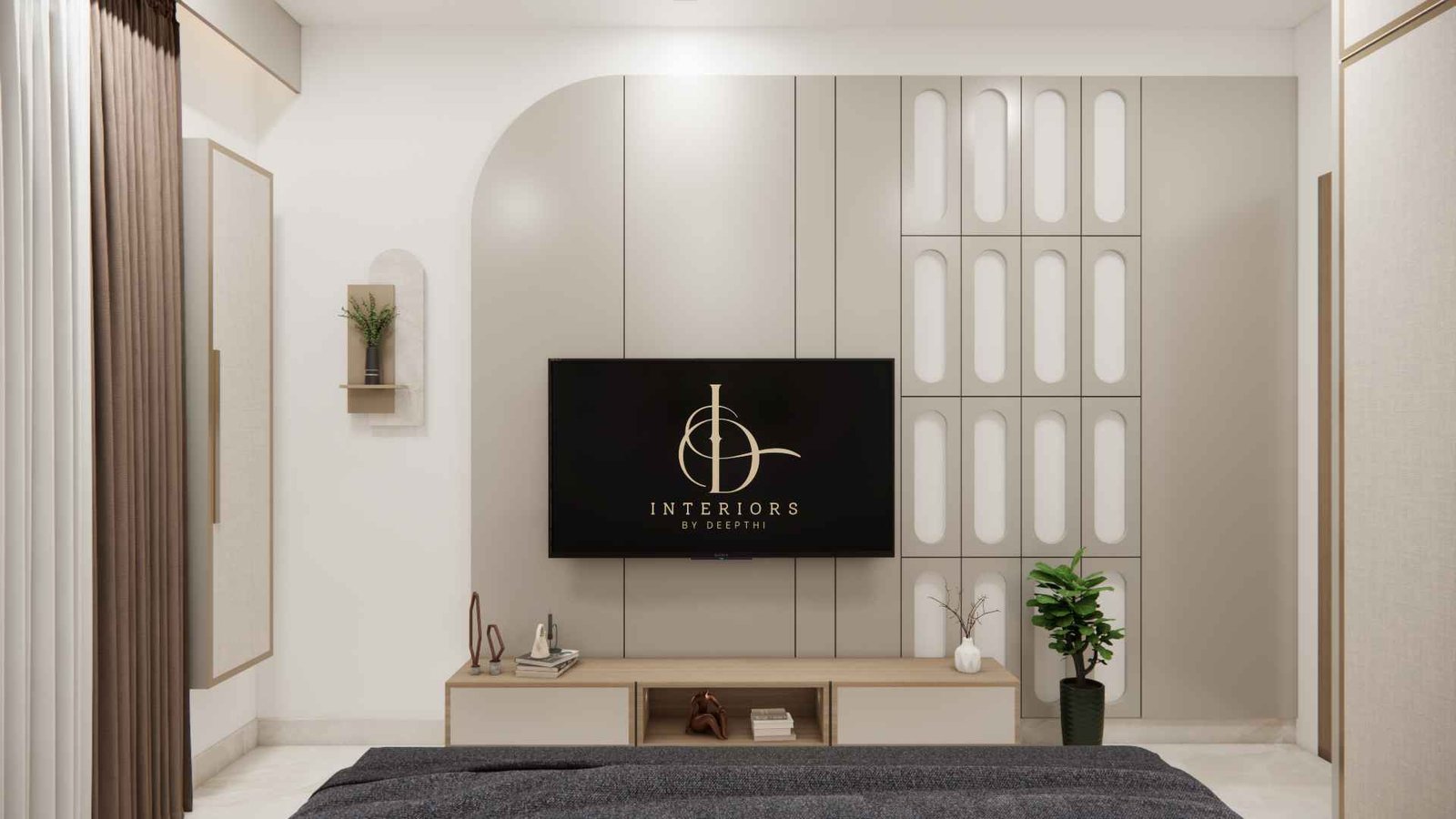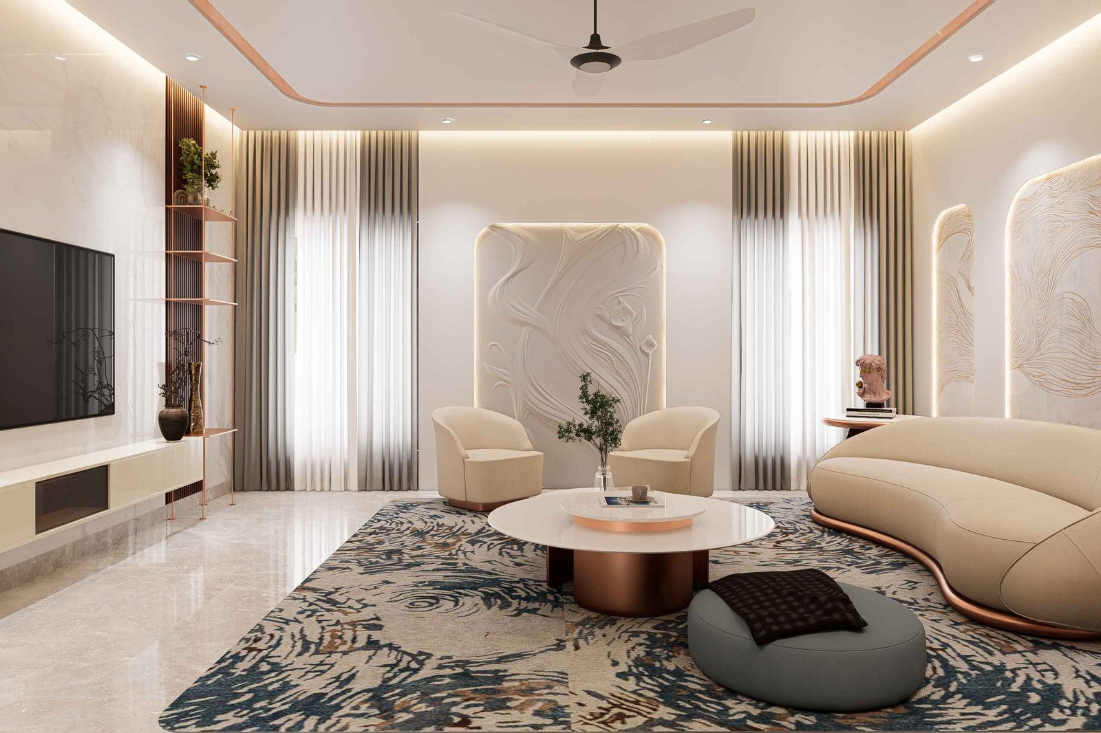 A floating TV unit with fluted panels anchors the room, flanked by open shelving for curated decor. The curved furniture, including a plush sofa and round chairs, adds softness and flow, while high-gloss coffee tables provide a stylish centerpiece.