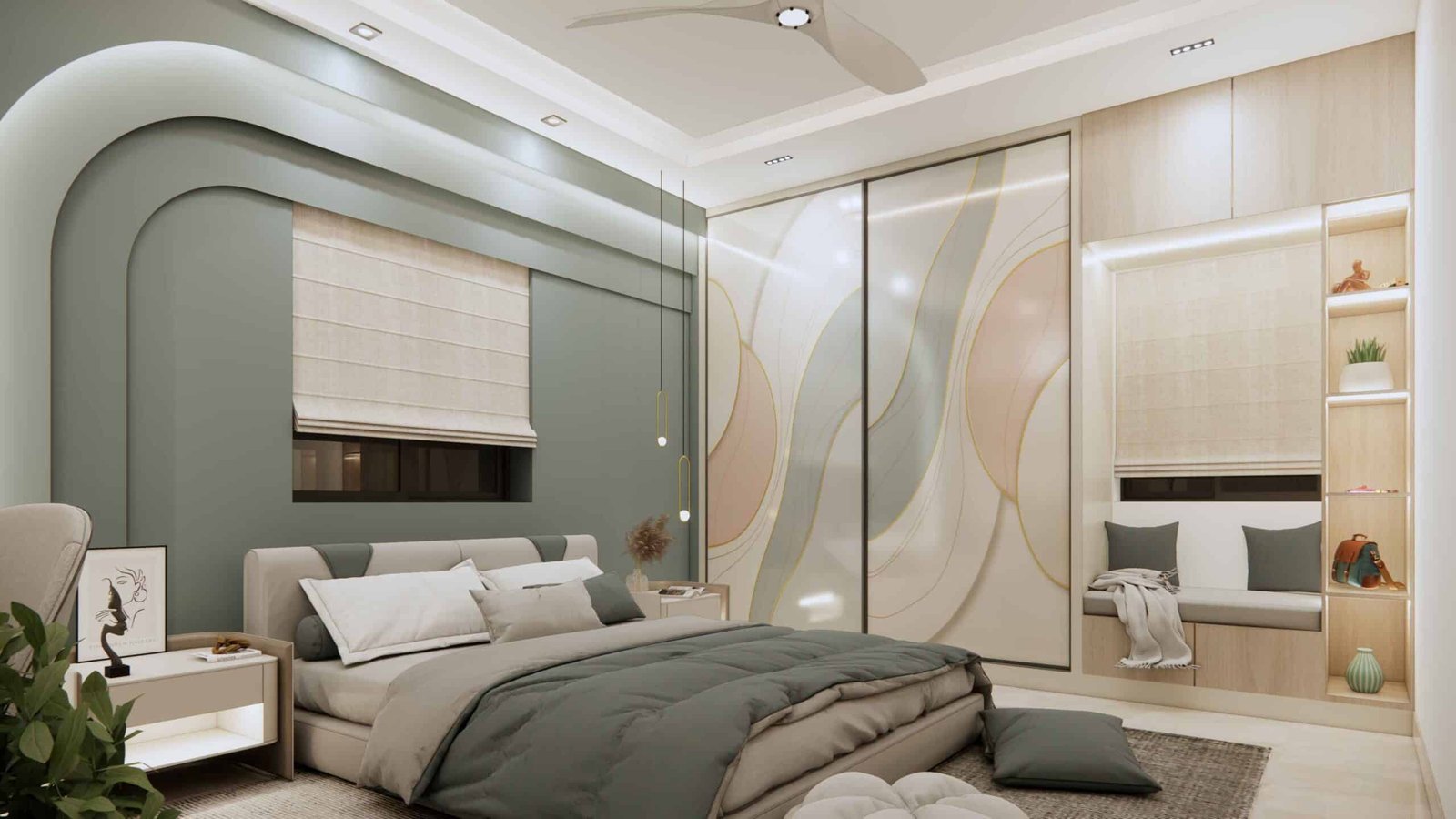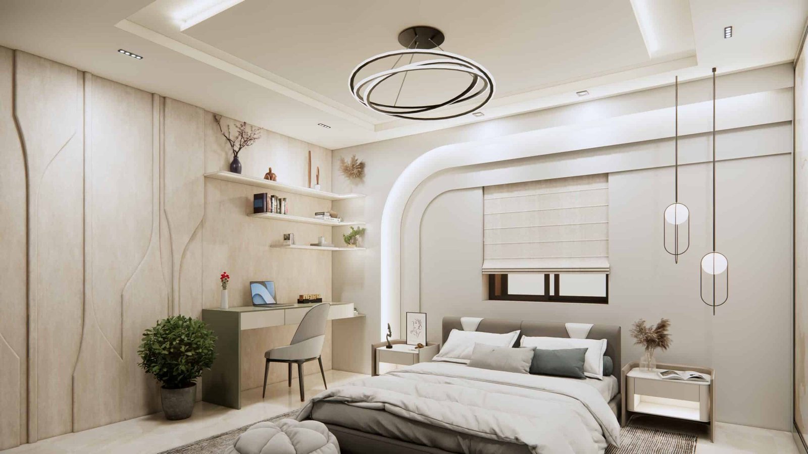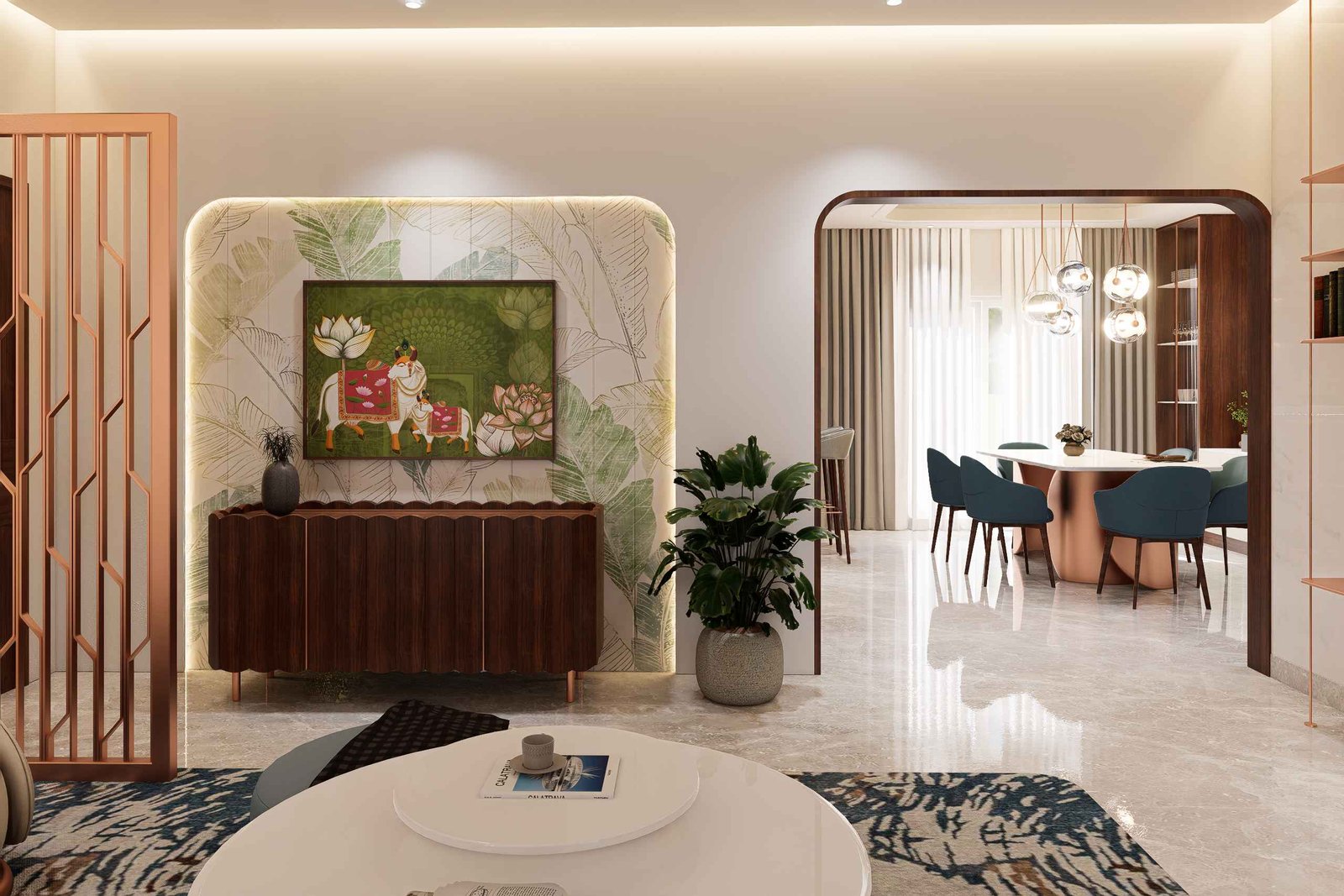 3D wall art and subtle lighting layers—including cove, spot, and natural light—enhance depth and ambiance. Artworks and decor reflect cultural and contemporary influences, creating a balanced, personalized space.