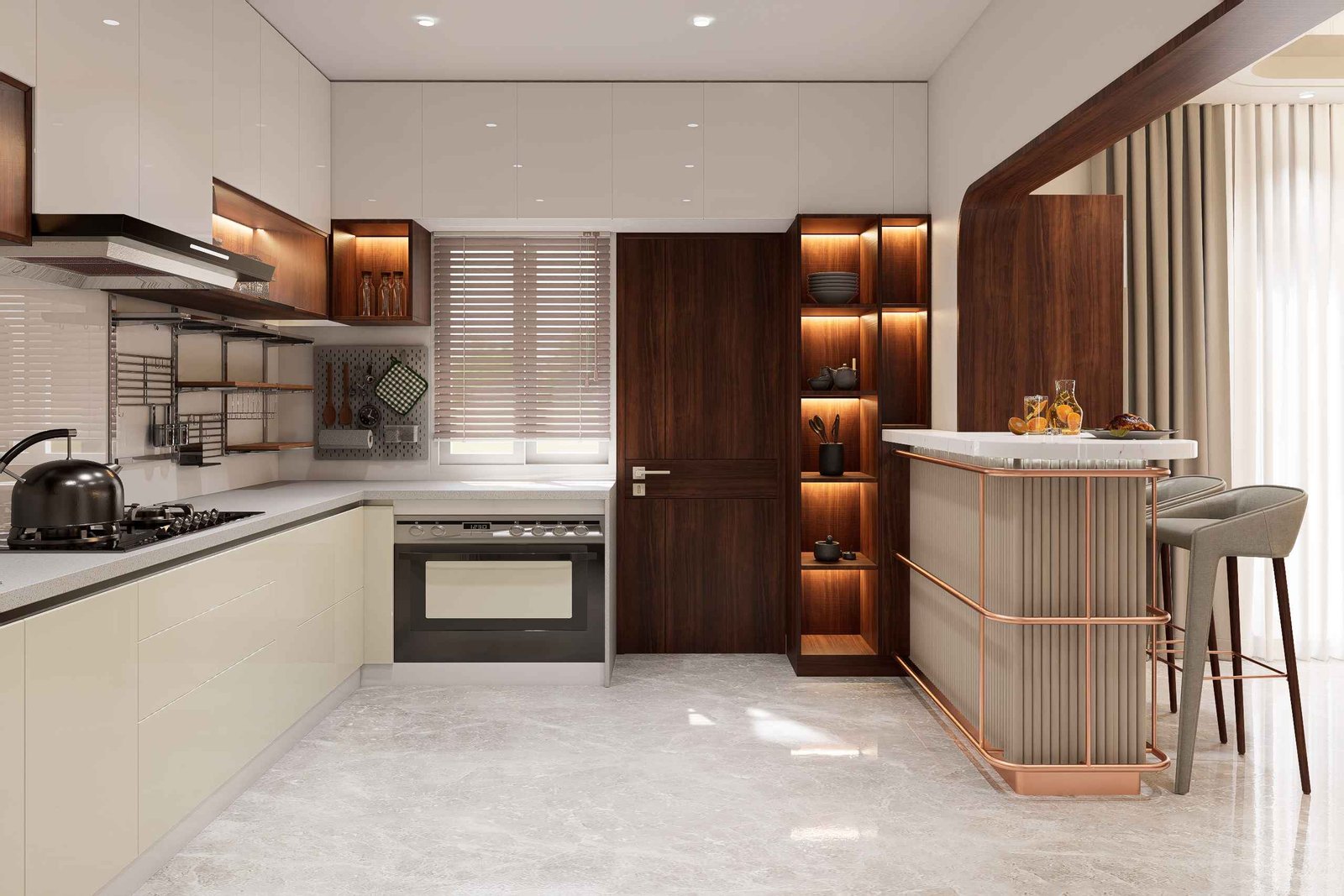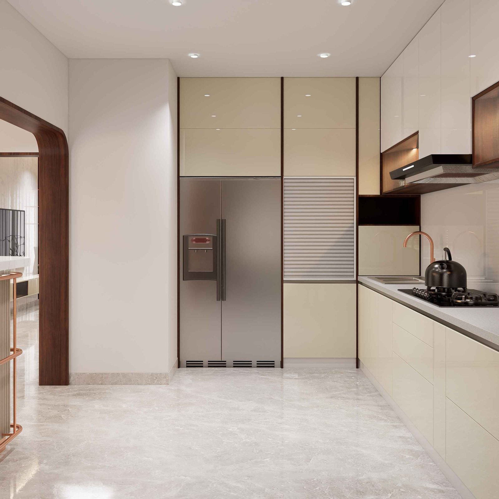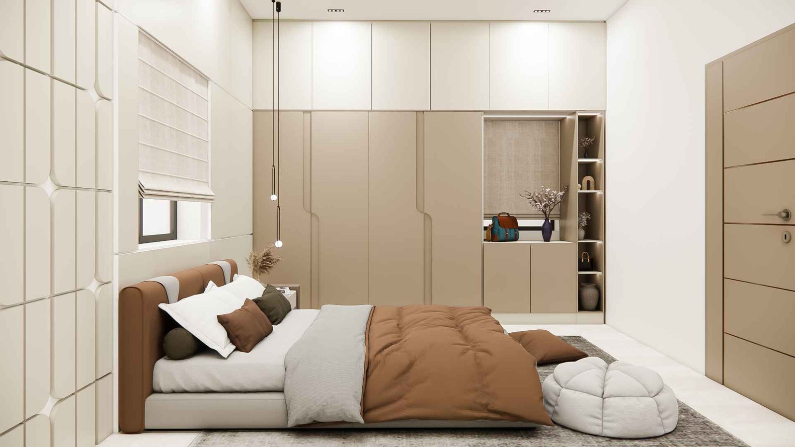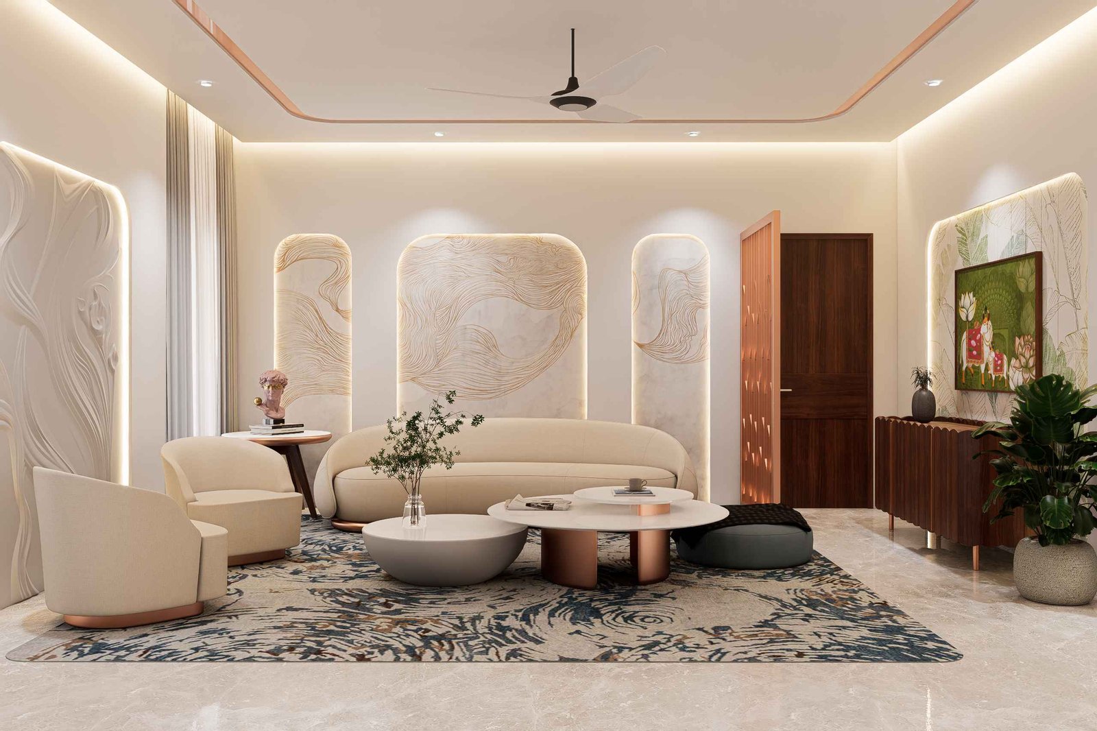 This living space blends modern luxury with organic elegance, using a soft neutral palette of ivory, taupe, and walnut enriched with copper accents for warmth and sophistication. The design emphasizes clean lines, sculptural forms, and a calming atmosphere.
