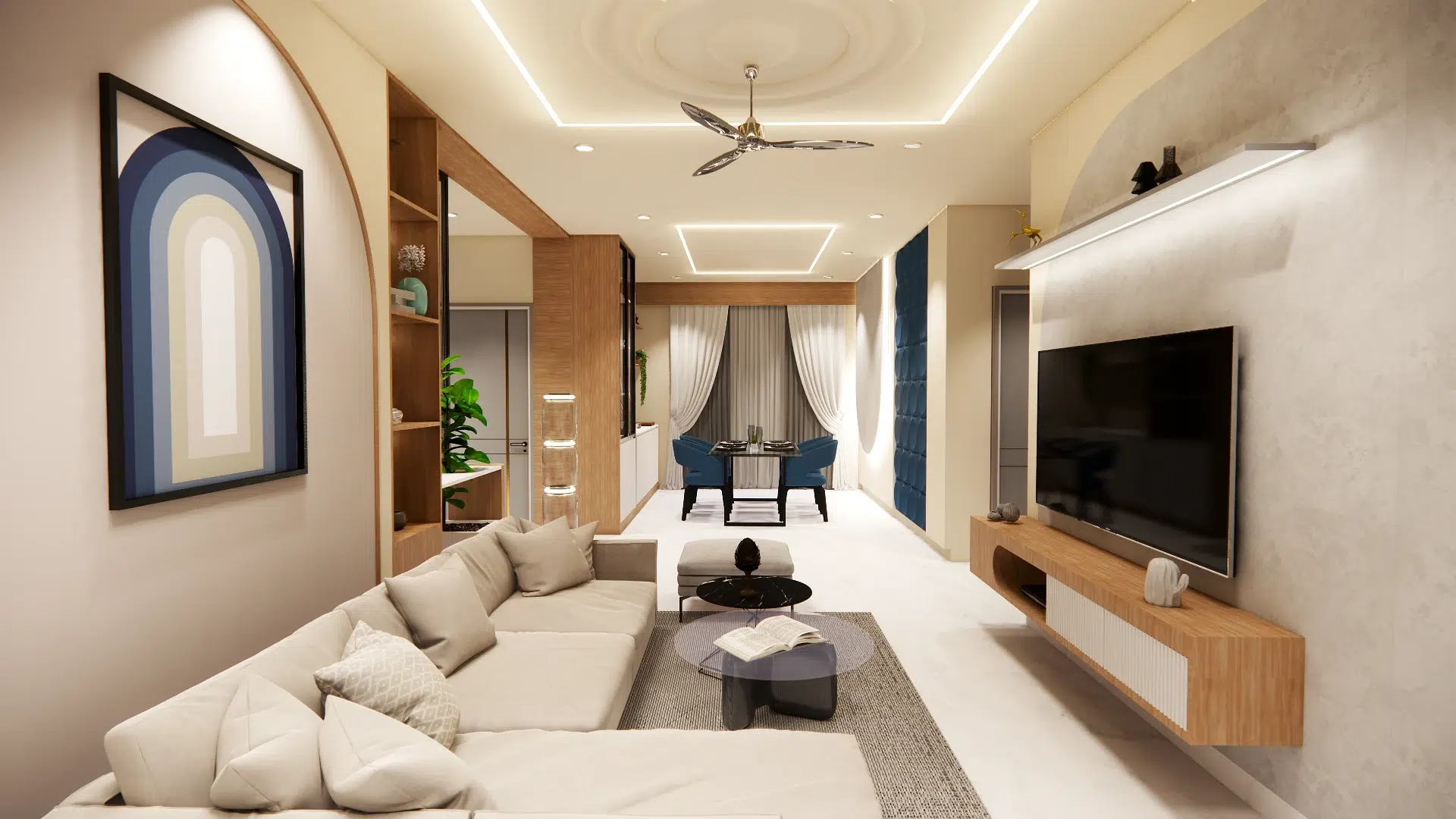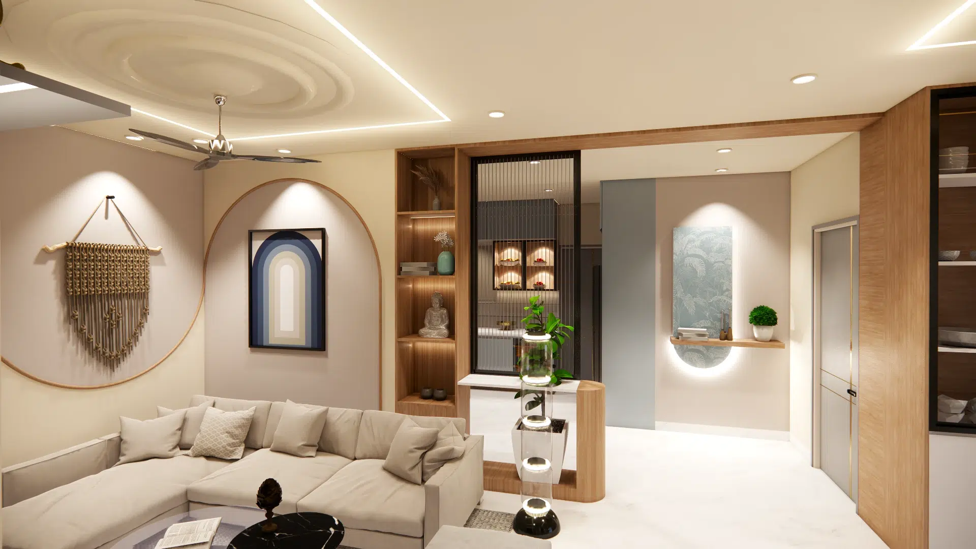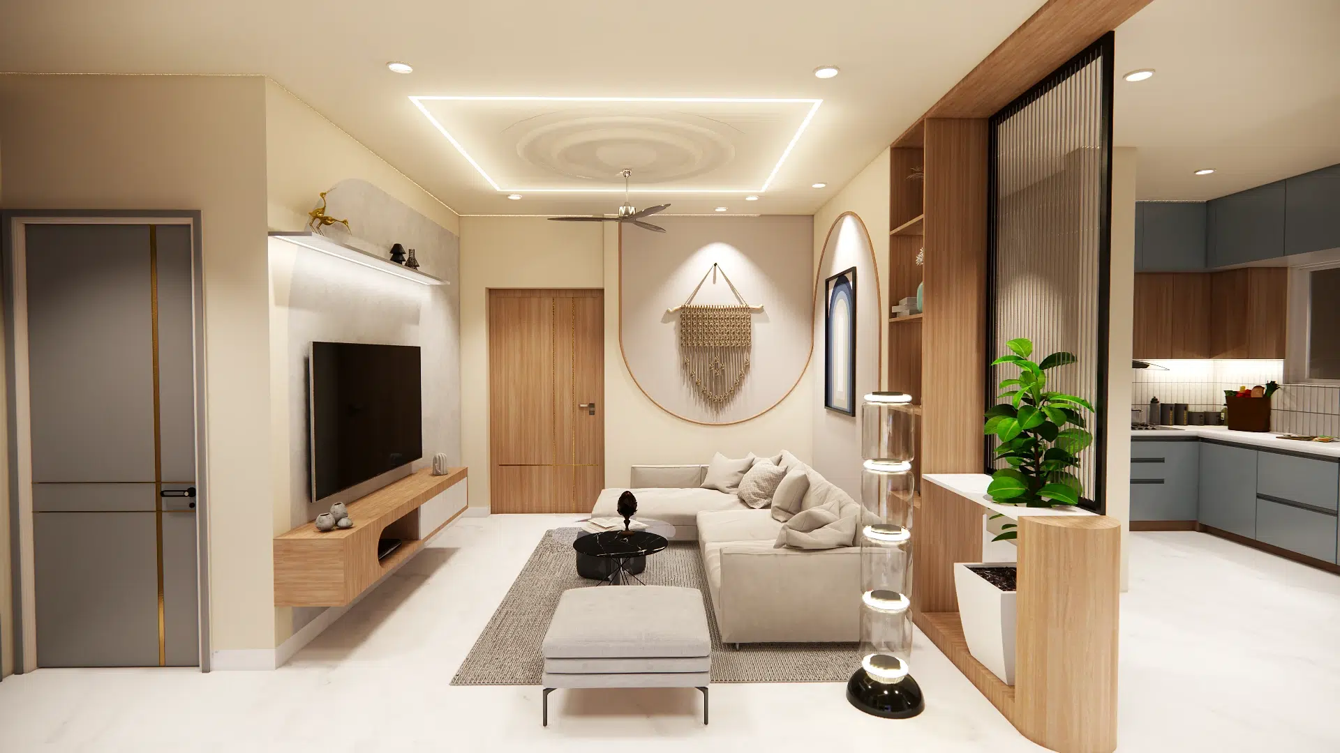 The living area is defined by a low-profile modular sofa, circular ceiling molding with integrated LED lighting, and a subtle play of geometric wall decor. A sleek floating TV unit and black coffee table add contrast and functionality, while the custom wood and fluted glass partition gently separates the kitchen without closing off the open-plan layout.