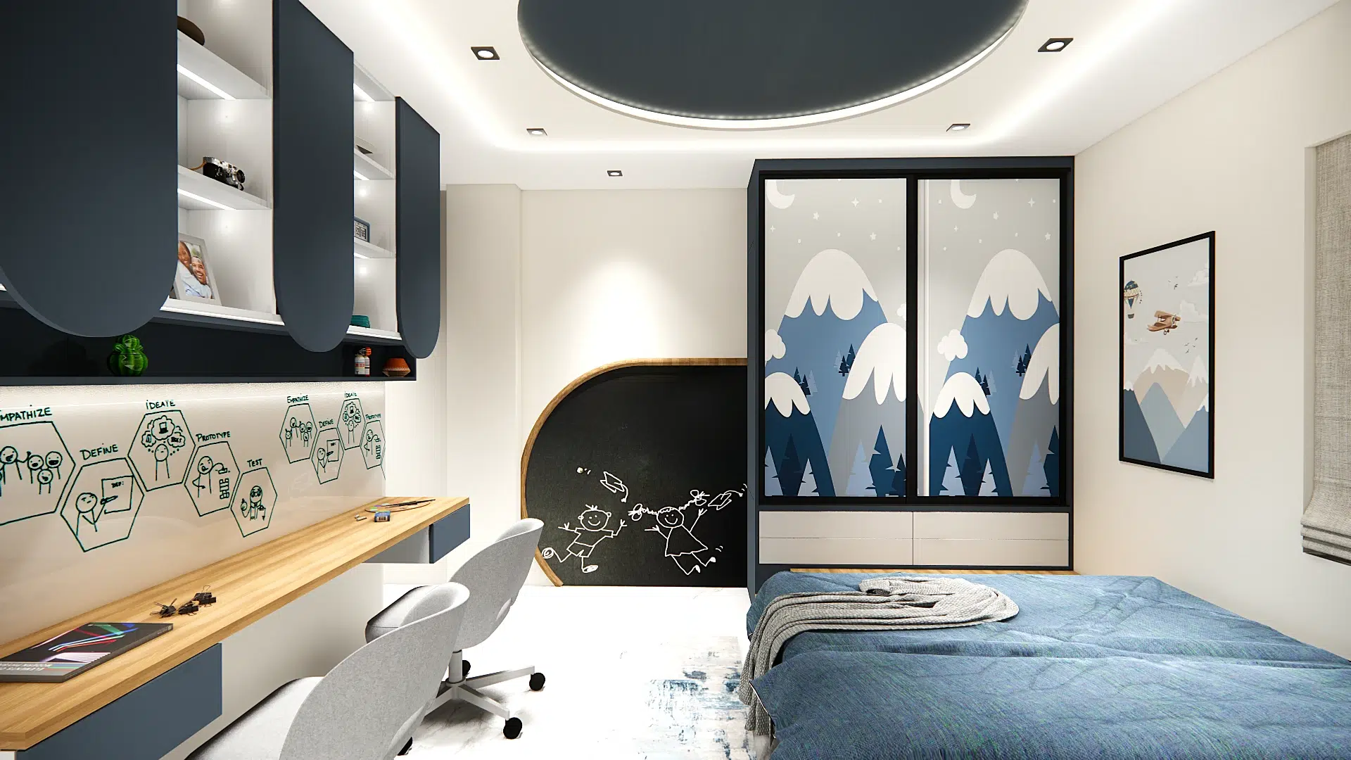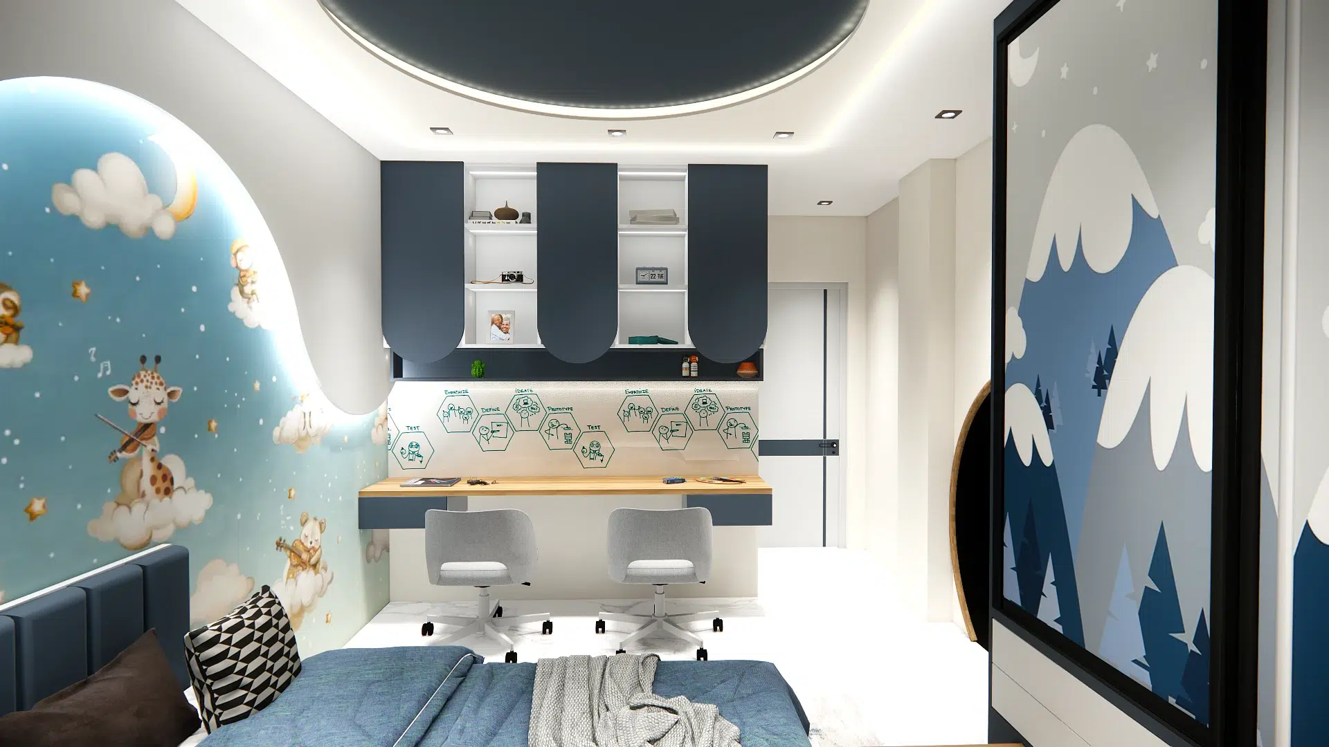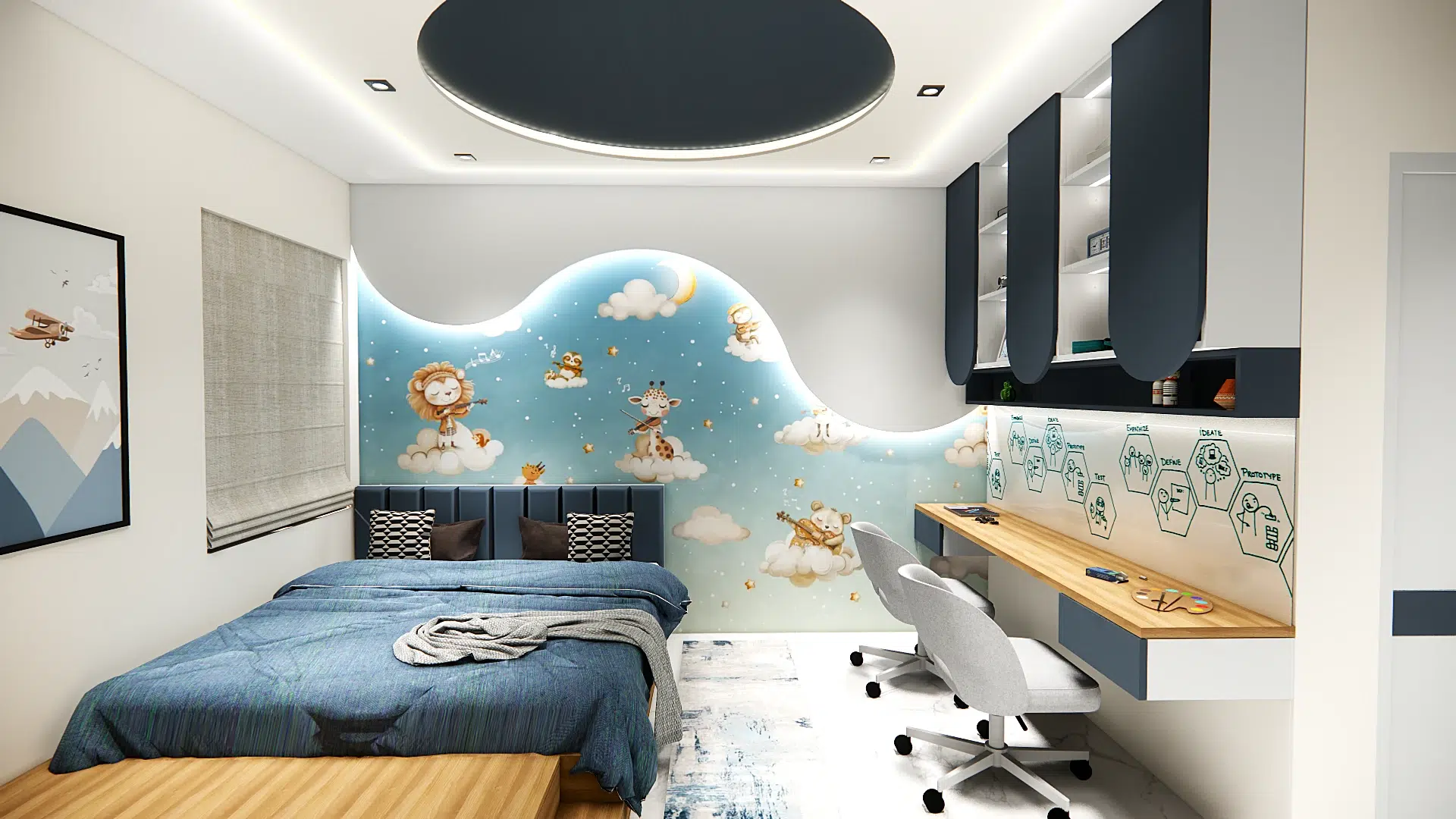The living area is defined by a low-profile modular sofa, circular ceiling molding with integrated LED lighting, and a subtle play of geometric wall decor. A sleek floating TV unit and black coffee table add contrast and functionality, while the custom wood and fluted glass partition gently separates the kitchen without closing off the open-plan layout.